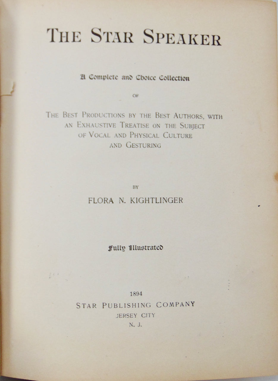 Kightlinger, Flora N. The Star Speaker : A Complete and Choice Collection of The Best Productions by the Best Authors, with an Exhaustive Treatise on the Subject of Vocal and Physical Culture and Gesturing. Jersey City, NJ: Star Publishing Co., 1894. First Edition. [11707]