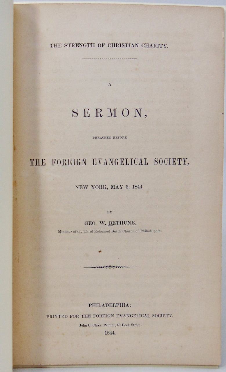 Bethune, George W. The Strength of Christian Charity: A Sermon, preached before The Foreign Evangelical Society, New York, May 5, 1844. Philadelphia: Printed for the Foreign Evangelical Society, John C. Clark, Printer, 1844. First Edition. [10718]