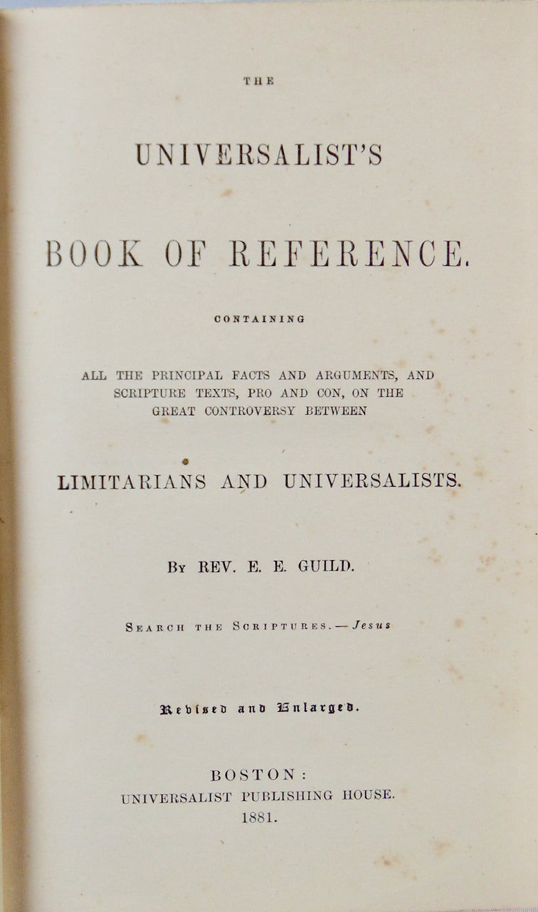 Guild, E. E. The Universalist's Book of Reference containing All the Principal Facts and Arguments, and Scripture Texts, Pro and Con, on the Great Controversy between Limitarians and Universalists. Boston: Universalist Publishing House, 1881. Revised and Enlarged. [11817]