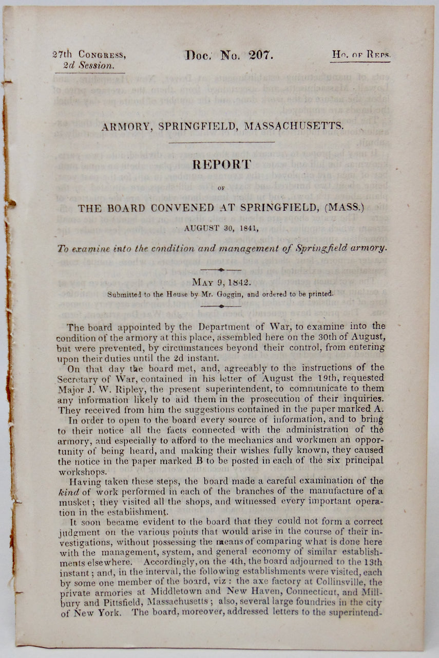Davies, Charles; et al. Armory, Springfield, Massachusetts (Doc. No. 207) Report of the Board convened at Springfield, (Mass.) August 30, 1841, To examine the condition and management of Springfield armory. Washington DC: Government Printing Office, 1842. [11666]