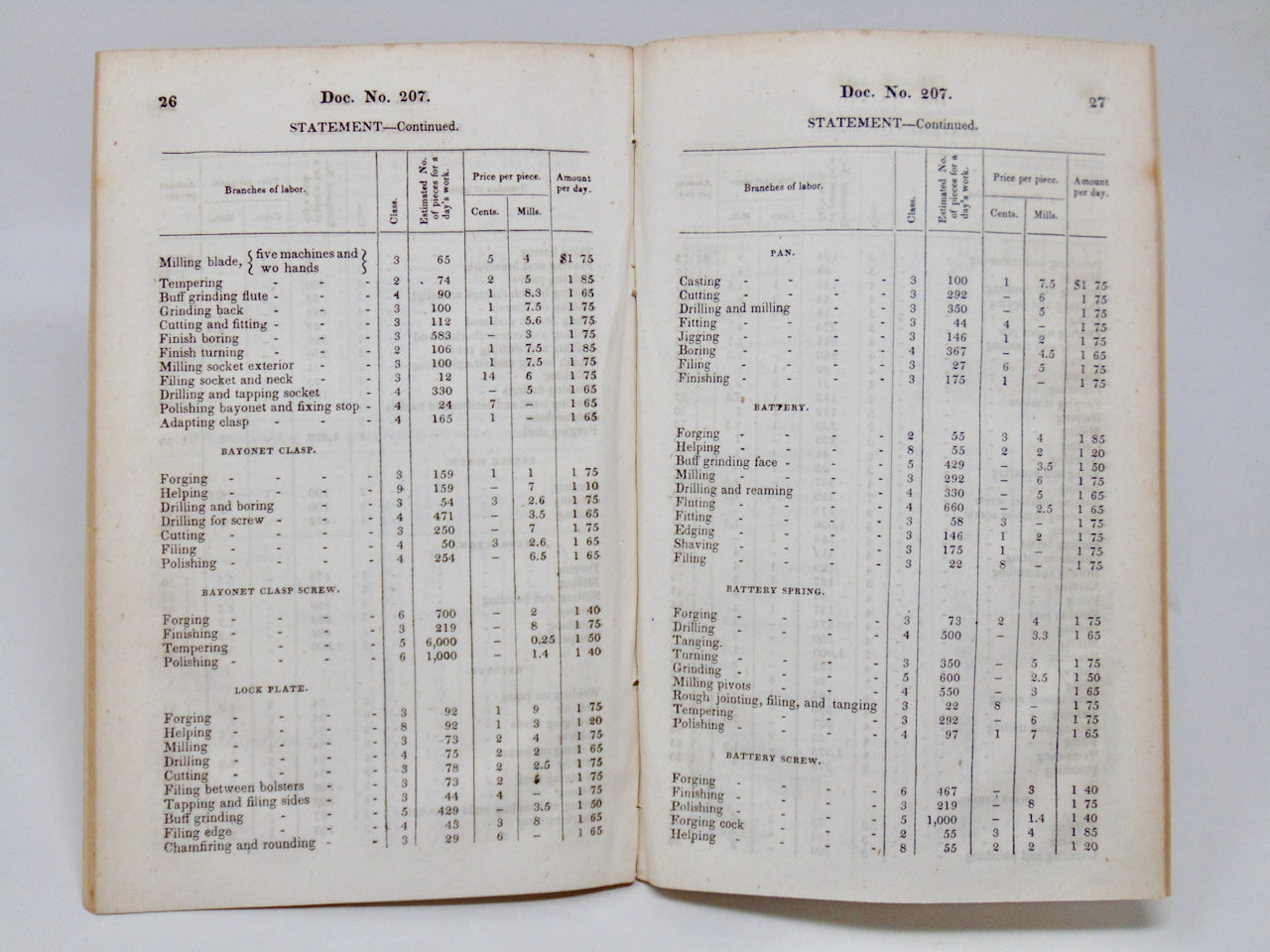 There were six workshops at the armory involved in the production of the musket used by US military forces. The board of inspectors visited each one, and interviewed the mechanics and workmen, and inspected the shops. About 260 men worked in the shops, and there was an additional staff of supervisors. The board herein makes several recommendations, including that the Ordnance department of the military be in control of the armory, rather than private contractors. 305 persons are listed by name, with their occupation and yearly salary. A series of verbatum interviews regarding the operations of the various shops are related. A series of charts with proposed labor rates show exactly the operations of the men in the shops.