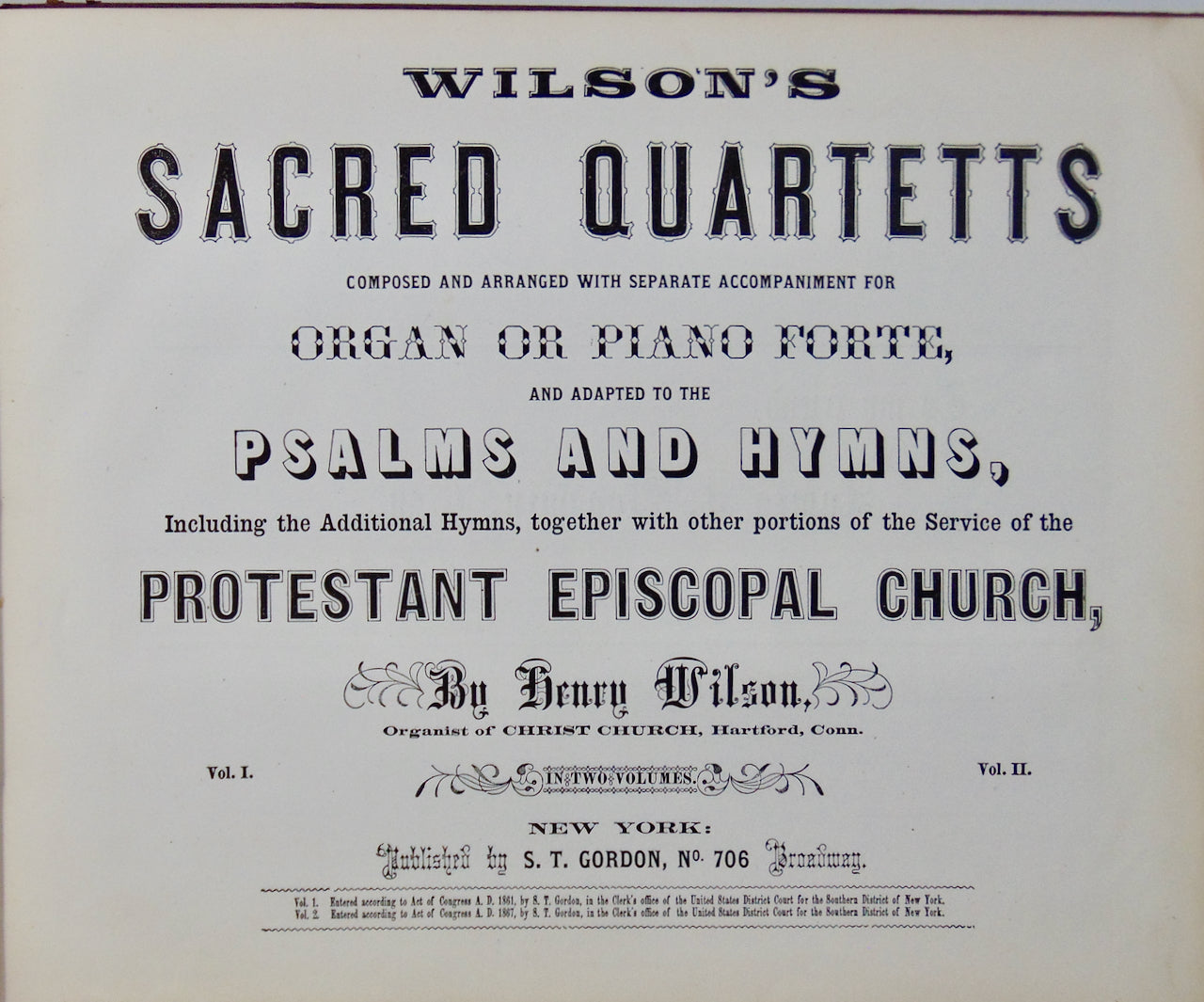 Wilson, Henry. Wilson's Sacred Quartetts composed and arranged with separate accompaniment for Organ or Piano Forte, and adapted to Psalms and Hymns, Including the Additional Hymns, together with other portions of the Service of the Protestant Episcopal Church. New York: S. T. Gordon, 1867. [11764]