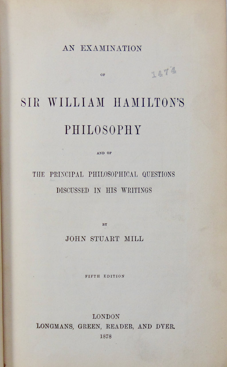 Mill, John Stuart. An Examination of Sir William Hamilton's Philosophy and of the Principal Philosophical Questions Discussed in his Writings. London: Longmans, Green, Reder, and Dyer, 1878. Fifth Edition. [11540]