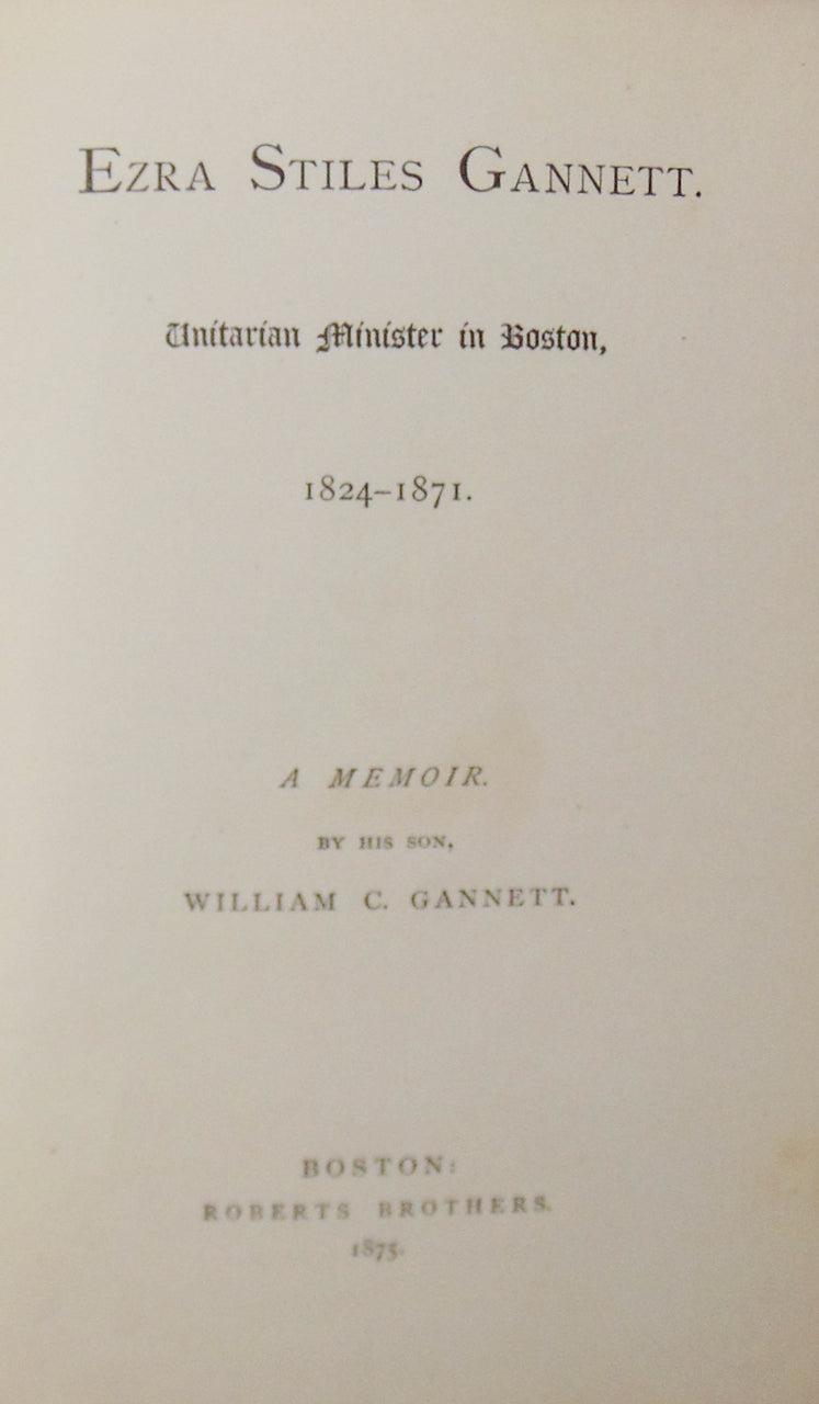 Gannett, William C. Ezra Stiles Gannett : Unitarian Minister in Boston, 1824-1871; A Memoir by his son, William C. Gannett. Boston: Roberts Brothers, 1875. First Edition. [11532]