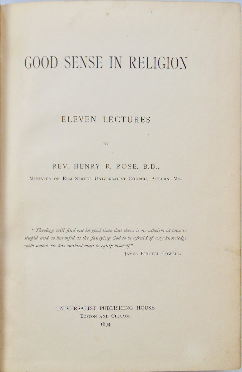 Rose, Henry R. Good Sense in Religion: Eleven Lectures. Boston and Chicago: Universalist Publishing House, 1894. First Edition. [11232]