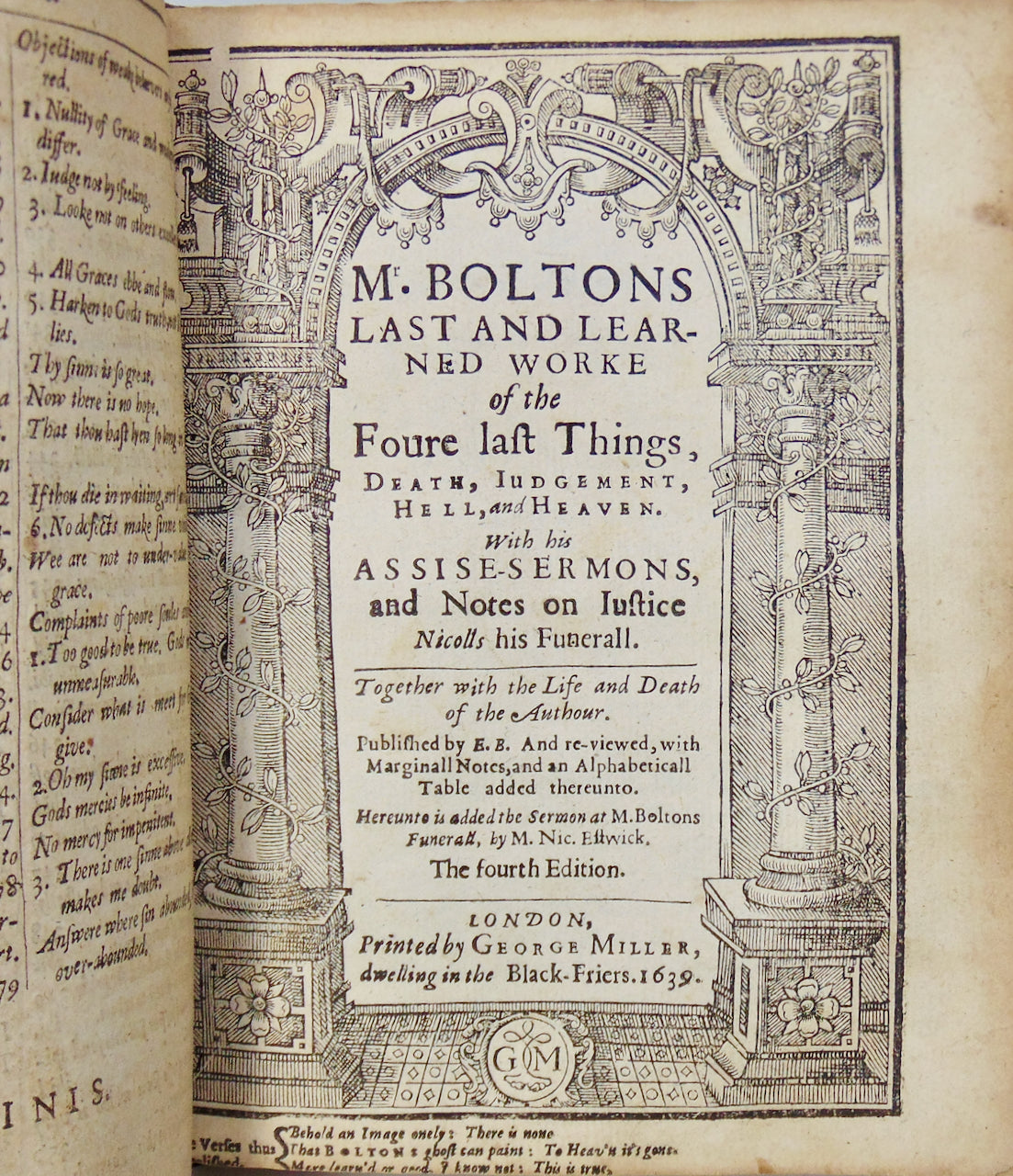 2. Mr. Boltons Last and Learned Worke of the Foure last Things, Death, Judgement, Hell, and Heaven. With his Assise-Sermons, and Notes on Iustice Nicolls his Funerall. Together with the Life and Death of the Author. Published by E. B. and re-viewed, with Marginall Notes, and an Alphabeticall Table added thereunto. Hereunto is added the Sermon at M. Boltons Funerall, by M. Nic. Estwick. The fourth Edition. London: Printed by George Miller. 1639. Engraved tp with columns and arch. ESTC S122207. [2], 1-264, [8], [6], 1-97, [2], 1-70 pp. This copy does not have the "Life and Death."