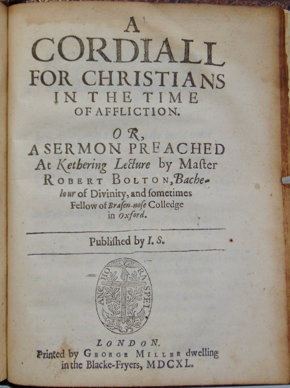 4. A Cordiall for Christians in the Time of Affliction. Or, A Sermon Preached at Kethering Lecture by Master Robert Bolton, Bachelour of Divinity, and sometimes Fellow of Brasen-nose Colledge in Oxford. Published by I. S. London: Printed by George Miller. 1640. ESTC S122177. "Sometimes bound as part of STC 3245 and consequently as part of Wing B3512." [8]. 1-27 pp. Staining to margins. Does not contain "Discourse about the state of true happiness," called for at ESTC.