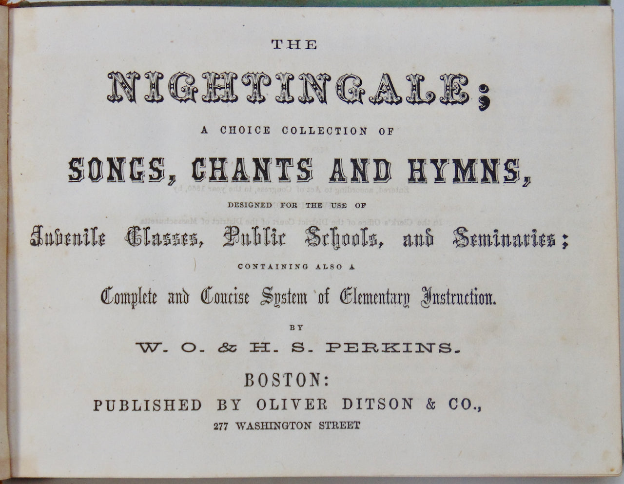 Perkins, W. O.; Perkins, H. S. The Nightingale; A Choice Collection of Songs, Chants and Hymns, designed for the use of Juvenile Classes, Public Schools, and Seminaries; containing also a Complete and Concise System of Elementary Instruction. Boston: Oliver Ditson & Co., (1860). [11317]