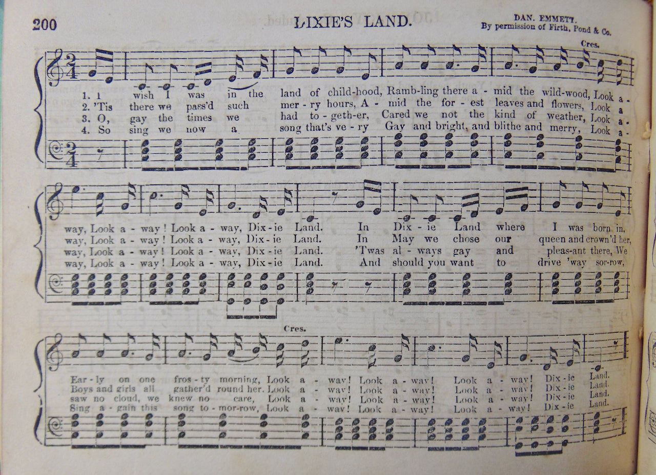 There are some differences in the song for what would soon become a rallying song for the Confederate South, for instance, the first line is "I wish I was in the land of child-hood," rather than "the land of cotton." The chorus has "A-way down east in Dixie," rather than 'A-way down south in Dixie."