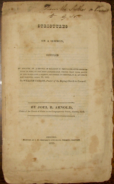 Arnold, Joel R. Strictures on a Sermon, entitled An Account of the Revival in Jerusalem, with Observations on some of the most remarkable things that took place in the work. Or, A Sermon, delivered in Chester, N. H. on Lord's Day Morning, April 20, 1823, By William Taylor, Pastor of the Baptist Church in Concord. Concord: J. W. Shepard's Office, 1823. First Edition. [3512]
